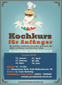 Die Kochkurs-Termine für das 1. Halbjahr 2018 stehen fest! Gekocht wird wie immer im Bürgerzentrum Kalk. Die Kurse finden immer samstags, von 11 – 14 Uhr statt.